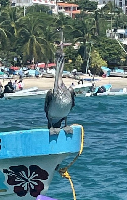 When he sees a turtle, he dives into the water with a rope tied around his hand to attach himself to the boat. He catches the turtle, brings it close to the boat where we can see her up close and personal. This is a dolphina turtle. There are about 5 different kinds that live in the water around Puerto Escondido. As soon as the boat man let go of the turtle, she swam and disappeared into the depths. Thank you for the encounter.